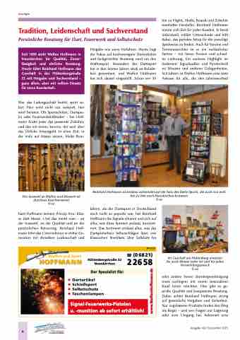 hin zu Flights, Shafts, Boards und Zubehör namhafter Hersteller. Reinhard Hoffmann nimmt sich Zeit für jeden Kunden. Er berät individuell, erklärt Unterschiede und hilft dabei, das perfekte Setup für die jeweilige Spielweise zu finden. Auch für Vereine und Turnierausrichter ist er ein verlässlicher Partner – mit fairen Preisen und schnel- ler Lieferung. Ein weiteres Highlight im Sortiment: Signalwaffen und Pyrotechnik zu Silvester und anderen Gelegenheiten. Seit Jahren ist Waffen Hoffmann eine feste Adresse für alle, die den Jahreswechsel