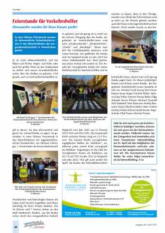 zu geleiten und oft genug ist es nicht nur der sichere Übergang über die Straße, der gefordert ist. Verkehrshelfer:innen sind auch „Schuhezubinder“, „Streitschlichter“, „Tröster“ und „Beruhiger“. Wenn man sich die Unfallstatistiken anschaut, wird einem bewusst, wie gefährdet die Kinder sind. Im Saarland wurde im Jahr 2023 bei einem Verkehrsunfall kein Kind getötet, was schon einmal sehr positiv ist. Die An- zahl der verunglückten Kinder bei einem Verkehrsunfall im Saarland erhöhte sich im