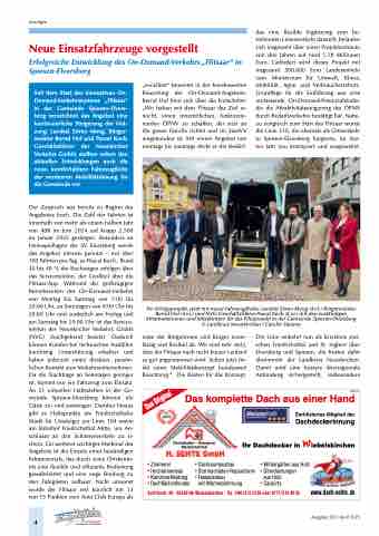 „excellent“ bewertet in der bundesweiten Bewertung der On-Demand-Angebote. Bernd Huf freut sich über die Fortschritte: „Wir haben mit dem Flitsaar das Ziel er- reicht, einen innerörtlichen, funktionie- renden ÖPNV zu schaffen, der sich an die ganze Familie richtet und im SaarVV eingebunden ist. Mit einem Angebot von montags bis sonntags deckt er die Bedürf-