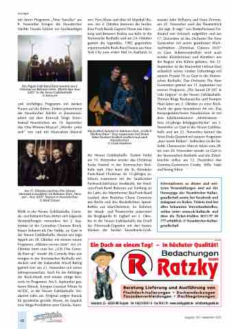 meister John Williams und Hans Zimmer, am 25. November wird das Theaterstück „Sie sagt. Er sagt.“ von Bestsellerautor Fer- dinand von Schirach aufgeführt und am 17. Dezember ist das Orchester The New Generation mit seiner grandiosen Weih- nachtsshow „Christmas Classics 2025“ zu Gast. Selbstverständlich wird auch wieder Künstlerinnen und Künstlern aus der Region eine Bühne geboten. Am 12. September ist der Klarinettist Helmut Eisel anlässlich seines runden Geburtstags mit seinem Projekt 70 zu Gast in der Stumm- schen Reithalle. Das Orchester The New Generation gastiert am 13. September mit seinem Programm „The Sound Of 007 & Udo Jürgens“ in der Neuen Gebläsehalle. Thomas Blugs Rockanarchie und Stompin Heat laden am 2. Oktober zu einer Rock- Nacht der ganz besonderen Art ein. Das Kreisjugendorchester Neunkirchen ist mit dem Jubiläumskonzert „Meilensteine - Eine 20-jährige Erfolgsgeschichte“ am 2. November zu Gast in der Neuen Gebläse- halle und am 22. November kommt das Nino Deda Quartett mit seinem Programm „Jazz meets Balkan“. Außerdem ist der be- liebte Chansonnier Marcel Adam vom 28. bis zum 30. November wieder zu Gast in der Stummschen Reithalle und die Zirbel- knechte zollen am 12. Dezember den Grammy-Gewinnern Crosby, Stills, Nash und Young Tribut.