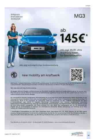 Ein unverbindliches Gewerbe-Leasingangebot (Kilometerleasing) der Arval Deutschland GmbH, Barjuwarenring 5,82041 Oberhaching für das Fahrzeug MG3 Hybrid+ Standard in Dover white. Anschaffungspreis 17.344,54 €*, zzgl. 839,50 € Transportkosten (separate Berechnung), O € Sonderzahlung, 145,00 € mtl. Leasingrate, 60 Leasingraten, 5.000 km Laufleistung pro Jahr, 8718,60€ Gesamtbetrag aller Raten & Sonderzahlungen zzgl. 839,50 € (separate Berechnung) Transportkosten, exkl. Services. Ausgenommen gewerbliche Sonderabnehmer: Personenbeförderung, Fahrzeuge mit Signalanlage, Untervermietung, Vermietgesellschaften sowie alle Branchen gemäß der Arval Policy. Bonität vorausgesetzt. Alle Preise verstehen sich exkl. MwSt. Das Leasingangebot gilt nur für Gewerbekunden. Angebot gilt nur bei Bestelldatum im Zeitraum vom 01.07.2025 bis 30.09.2025. Weitere Informationen zum Fahrzeug und zu Kauf, Leasing und Finanzierung erhalten Sie bei uns.