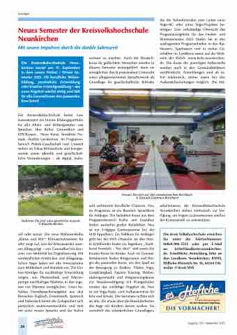 die die Teilnehmenden zum Leiten einer Yoga-AG oder eines Yoga-Projektes be- nötigen. Eine vollständige Übersicht des Programmangebots für das Herbst- und Wintersemester 2025 finden Sie in den ausliegenden Programmheften in den Rat- häusern, Sparkassen und in vielen Ge- schäften im Landkreis sowie auf der Web- seite der KVHS: www.kvhs-neunkirchen. de. Die Kurse der jeweiligen Außenstelle werden auch in den Gemeindeblättern veröffentlicht. Anmeldungen sind ab so- fort telefonisch, online sowie bei den Außenstellenleitungen möglich. Die Mit-