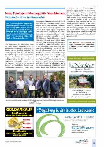 weiten Einsatzkonzepts zur Waldbrand- bekämpfung im Landkreis Neunkirchen. Oberbürgermeister Jörg Aumann: „Damit unsere Freiwillige Feuerwehr ihre gute und wichtige Arbeit ausüben kann, müs- sen wir regelmäßig in die technische Ausrüstung, den Fuhrpark und die Ge- bäude investieren. Danke an die Landes- regierung, speziell das Innenministerium, für die Unterstützung bei der Anschaffung der neuen Sonderfahrzeuge, die aufgrund ihrer Eigenschaften und Ausstattung auch außerhalb der Kreisstadt Neunkirchen ein- gesetzt werden.“
