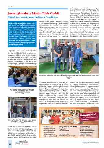 tion und automatisierter Fertigung vor. „Wir bleiben unserer Linie treu: Qualität mit Verantwortung. Die nächsten 60 Jahre be- ginnen jetzt“, so die Geschäftsführer Armin Fiack und Matthias Martinalt. Martin-Tools entwickelt seit Jahrzehnten innovative Lö- sungen für die Rohr- und Blechbearbeitung und ist spezialisiert auf die Fertigung von Werkzeugen und Maschinen – auch für besonders komplexe Bauteile. Ergänzend dazu konzipiert und produziert das Unter- nehmen individuelle Vorrichtungen sowie Prüflehren für Baugruppen, die höchste Genauigkeit und Funktionalität gewähr-