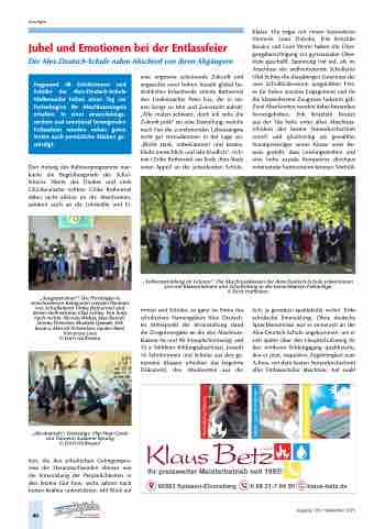 rinnen und Schüler, so ganz im Sinne des schulischen Namengebers Alex Deutsch. Im Mittelpunkt der Veranstaltung stand die Zeugnisvergabe an die drei Abschluss- klassen 9a und 9b (Hauptschulzweig) und 10 a (Mittlerer Bildungsabschluss). Jeweils 16 Schülerinnen und Schüler aus den ge- nannten Klassen erhielten das begehrte Dokument, drei Absolventen aus der
