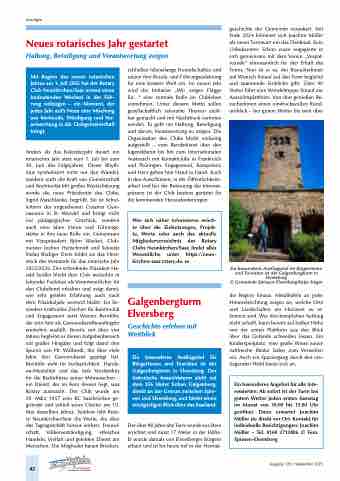 schließen lebenslange Freundschaften und setzen ihre Berufs- und Führungserfahrung für eine bessere Welt ein. Im neuen Jahr wird die Initiative „Wir zeigen Flagge für...“ eine zentrale Rolle im Clubleben einnehmen. Unter diesem Motto sollen gesellschaftlich relevante Themen sicht- bar gemacht und mit Nachdruck vertreten werden. Es geht um Haltung, Beteiligung und darum, Verantwortung zu zeigen. Die Organisation des Clubs bleibt vielseitig aufgestellt – vom Berufsdienst über den Jugenddienst bis hin zum internationalen Austausch mit Kontaktclubs in Frankreich und Thüringen. Engagement, Kompetenz und Herz gehen hier Hand in Hand. Auch in den Ausschüssen, in der Öffentlichkeits- arbeit und bei der Betreuung der Internet- präsenz ist der Club bestens gerüstet für die kommenden Herausforderungen.