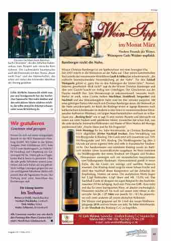 der Weißburgunder den ersten Eindruck mit Eleganz und Struktur. Zitrusaromen vereinigen sich mit mineralischen Assoziationen vom Vulkangestein (Bodenart). Harmonisierend gereift in neuer Eiche, die die Cuvée um würzige und vanilline Nuancen erweitert. Der Riesling-Anteil sorgt für einen Schuss Frische und stützt den Nachhall dieser Komposition auf der Zeitachse der Empfindung. Nomen est omen. Die analytischen Werte liegen bei 5,2g/l Restzucker, 6,2g/l Säure und Alk. 13,0% vol. Das Nachhall Cuvée ist übrigens ein super Beispiel für den hochinte- ressanten 2014er Jahrgang. Auch sein Preis von 5,49.- €uro netto und das für einen barriquierten Wein, ist absolut erschwinglich. Hinweisen möchte ich Sie noch auf unsere erste Messe in die- sem Jahr: Am 26. + 27. März von jeweils 10 – 18 Uhr, präsentie-