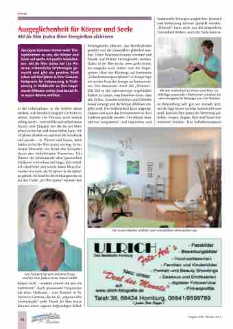 In der Lebensphase, in der Andere daran denken, sich beruflich langsam zur Ruhe zu setzen, startete Ute Pirmann noch einmal richtig durch – und erfüllte sich selbst einen Traum: eine Tätigkeit, bei der sie mit Men- schen zu tun hat und ihnen helfen kann. Mit 59 Jahren drückte sie nochmal die Schulbank und paukte – in Theorie und Praxis, denn beides ist bei Jin Shin Jyutsu wichtig. Es be- deutet übersetzt: die Kunst des Schöpfers durch den mitfühlenden Menschen. Das Wissen der Jahrtausende alten japanischen Heilkunst wird schon seit langer Zeit münd- lich überliefert und wurde durch Mary Bur- meister vor mehr als 50 Jahren in den West- en geholt. Sie brachte die Wirkungsweise so auf den Punkt: „Jin Shin Jyutsu“ repariert den