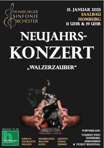 15. Januar 2023 Saalbau Homburg 11 Uhr & 19 Uhr NeuJahrs- KonZERT „Walzerzauber“ VERANSTALTET VON DER Vorverkauf: Tourist-Info Homburg 06841/101820 & TICKET REGIONAL Sopran: Charlotte Dellion Moderation: Roland Kunz LEITUNG: Stefan Zimmer