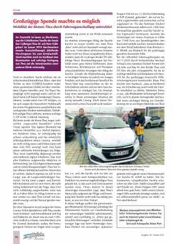 Im ohnehin schwierigen Alltag der Familie kommt es immer wieder vor, dass Thea „blau“ wird und mit Sauerstoff versorgt wer- den muss. Unter dieser schlimmen Situation leiden nicht nur Thea’s sympathische Eltern, sondern auch ihr 6-jähriger Bruder Till sehr. Infolge Thea’s Beeinträchtigungen hat Mo- bilität einen ganz hohen Stellenwert, denn Arzttermine, Klinikbesuche und Therapien unterschiedlichster Art prägen den Alltag der Familie. Gerade die Wahrnehmung dieser so wichtigen Termine ist jedoch ein riesiges Problem, weil das Familienauto beruflich für Thea’s Vater Kay unverzichtbar ist, der im Schichtdienst arbeitet und mit dem Auto Au- ßentermine zu erledigen hat. Die Anschaf- fung eines sparsamen Zweitfahrzeuges er- schien in dieser schwierigen Situation die einzig sinnvolle Lösung. Doch dieser Her- zenswunsch schien finanziell nicht realisier-