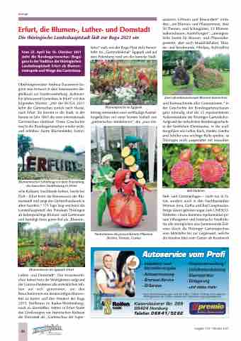 sche Kulissen, leuchtende Farben, herrlicher Duft – Erfurt feiert die Renaissance der Blu- menstadt und zeigt das Gärtnerhandwerk in allen Facetten.“ 171 Tage lang erscheint die Landeshauptstadt des Freistaats Thüringen als farbenprächtige Blumen- und Gartenoase und bestätigt ihren guten Ruf als „Blumen-,