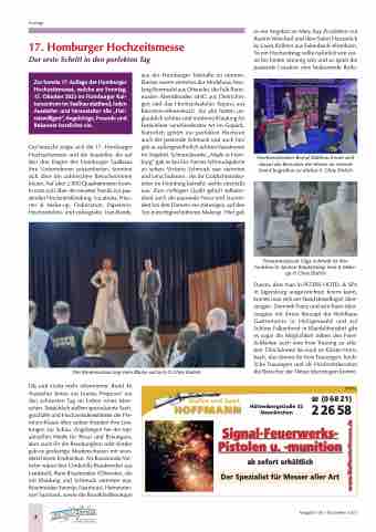 aus der Homburger Talstraße zu nennen. Ebenso waren vertreten das Modehaus Neu- fang-Rennwald aus Ottweiler, die Falk Braut- moden Abendmoden oHG aus Dietrichin- gen und das Hochzeitsatelier Tatjana aus Ramstein-Miesenbach. Sie alle hatten un- glaublich schöne und moderne Kleidung für Festivitäten verschiedenster Art im Gepäck. Natürlich gehört zur perfekten Hochzeit auch der passende Schmuck und auch hier gab es außergewöhnlich schöne Variationen im Angebot. Schmuckwerke „Made in Hom- burg“ gab es bei Eric Farries Schmuckgalerie zu sehen, Victoria Schmuck war vertreten und Lena Todorovi , die ihr Goldschmiedea- telier im Homburg betreibt, stellte ebenfalls aus. Zum richtigen Outfit gehört selbstre- dend auch die passende Frisur und (zumin- dest bei den Damen) ein stimmiges, auf den Typ zurechtgeschnittenes Makeup. Hier gab